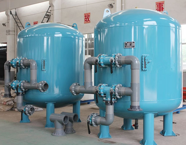 多介質(zhì)過濾器在運(yùn)行中是屬于壓力式過濾,過濾水流由于壓力的壓迫作用由進(jìn)水口進(jìn)到濾料層,濾料層中是由多種類型的砂粒排列而成,形成緊密的過濾層,使得存在水中的微粒可以獲得更多的機(jī)會(huì)與濾料發(fā)生碰撞,大顆粒等雜質(zhì)會(huì)在多介質(zhì)過濾器中的吸附與阻流作用而被濾層表面截留下來,從而可以獲得較為澄清的水,一般過濾之后的出水懸浮物含量<5mg/L。