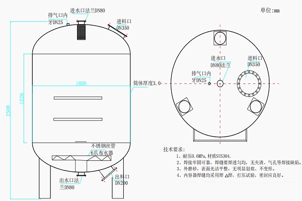 機械過濾器整體內部結構SUS304不銹鋼材質罐體,濾料層,進出水法蘭,排氣閥,進料口,布爪器、反洗排水口、順洗排水口、壓縮空氣進口等環節組成。
